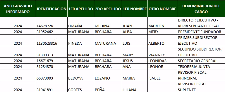 Información presentada en el formato 2531, sobre los cargos gerenciales y directivos de la Fundación “FUNALMEMA”.